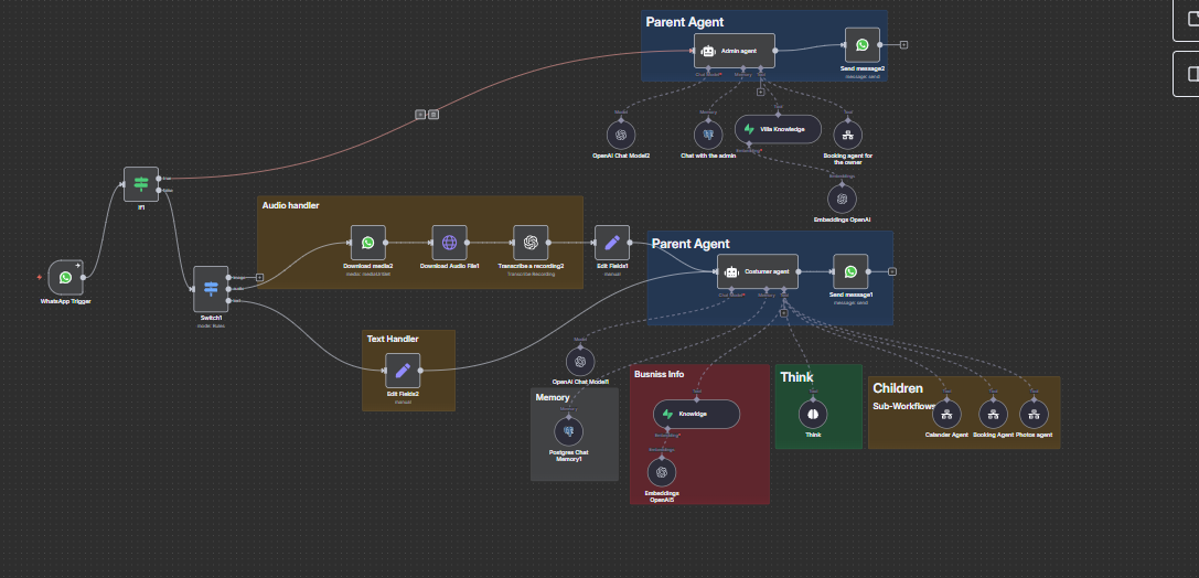 End-to-end guest house management through WhatsApp: automated booking confirmations, real-time calendar sync, instant photo and info sharing, and direct owner communication — all handled by AI agents working together.